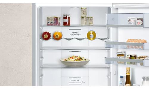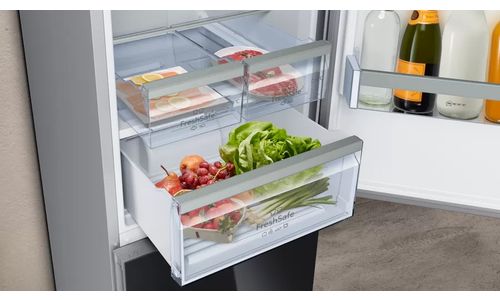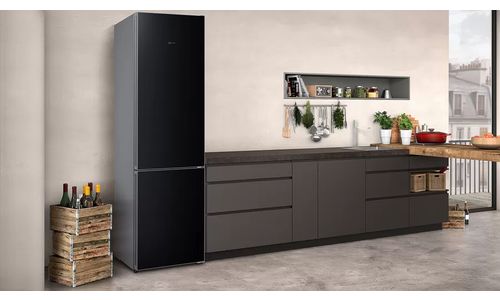Le grand combiné réfrigérateur-surgélateur pose-libre CoolCreative avec sa porte en verre magnétique et inscriptible conserve les aliments jusqu'à 2 fois plus longtemps et offre les meilleures conditions de congélation grâce au système NoFrost.