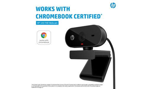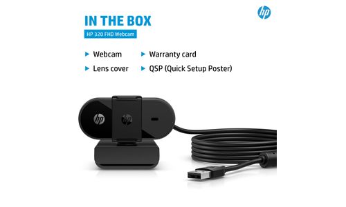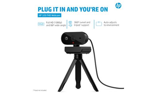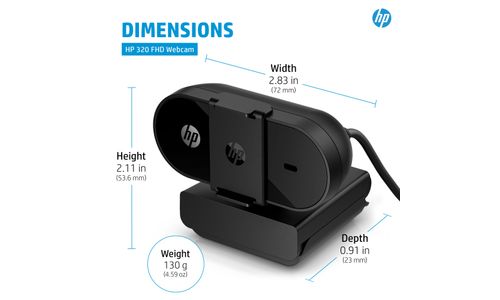 HP 320 FHD USB-A Webcam. Résolution vidéo maximale: 1920 x 1080 pixels, Cadence maximale: 30 ips. Interface: USB, Couleur du produit: Noir, Type de montage: A cliper/à poser. Prise en charge du système d'exploitation Windows: Windows 10,Windows 11, Prise en charge du système d'exploitation Mac: MacOS. Largeur: 72 mm, Profondeur: 53,6 mm, Hauteur: 53,2 mm