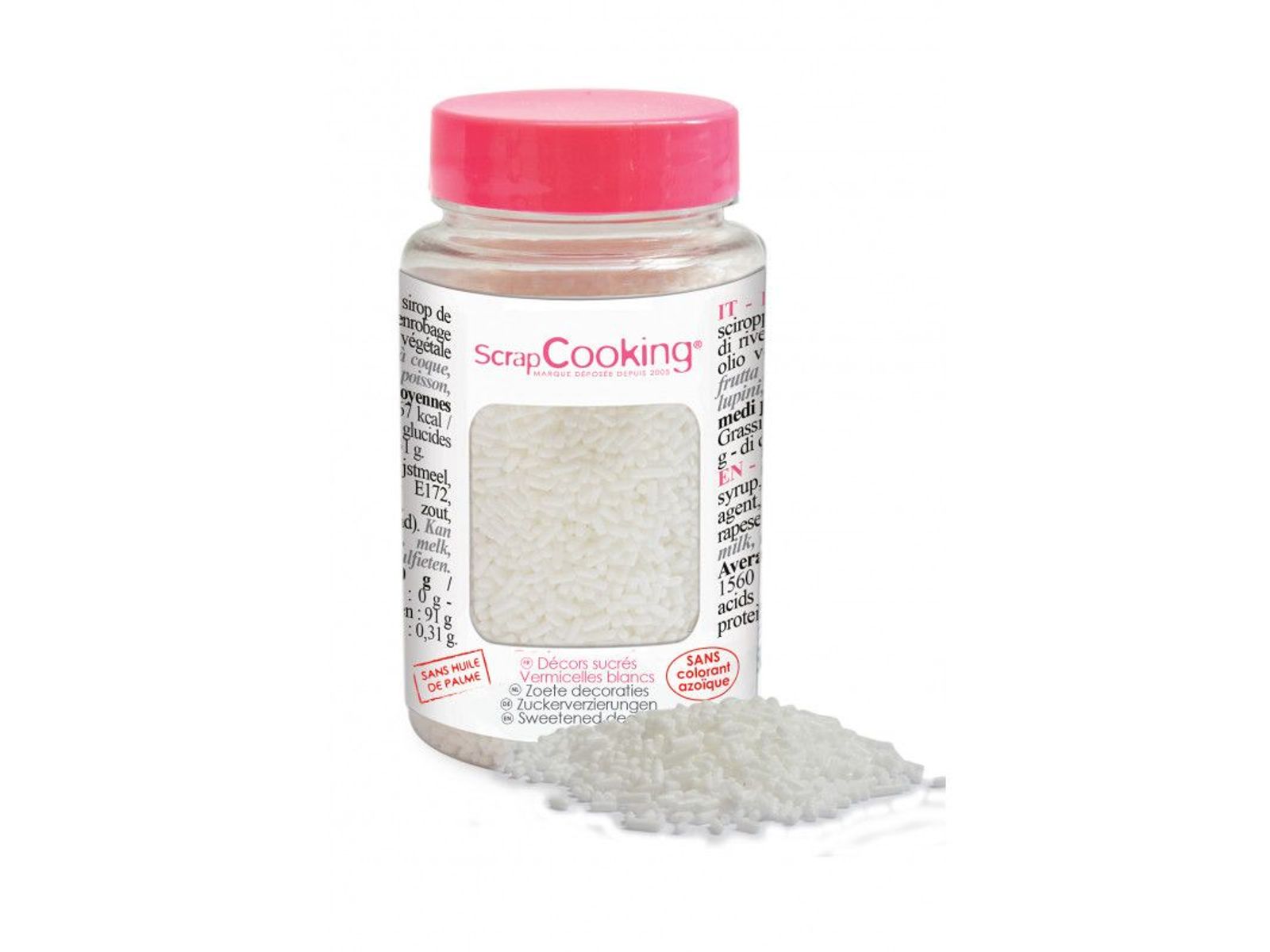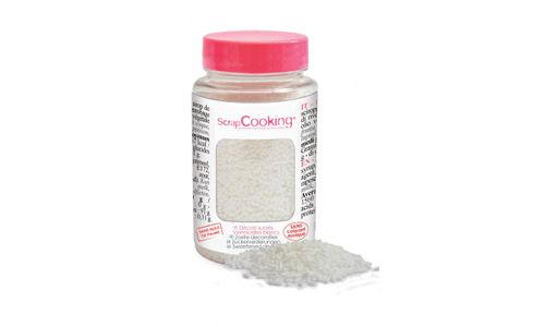 ScrapCooking® biedt zoete decoraties in een hersluitbare pot om je taarten, koekjes, cupcakes te verfraaien... Deze witte vermicelli-decoraties zijn vrij van palmolie.