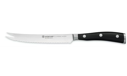 Het mes met gevorkte punt voor tomaten, kaas en fruit: de fijn gezaagde rand snijdt soepel door stevige bovenlagen, zoals korsten of schillen en is ook geschikt voor kaas of vele soorten fruit. De gevorkte punt is ontworpen om de kleine plakjes op te pakken.